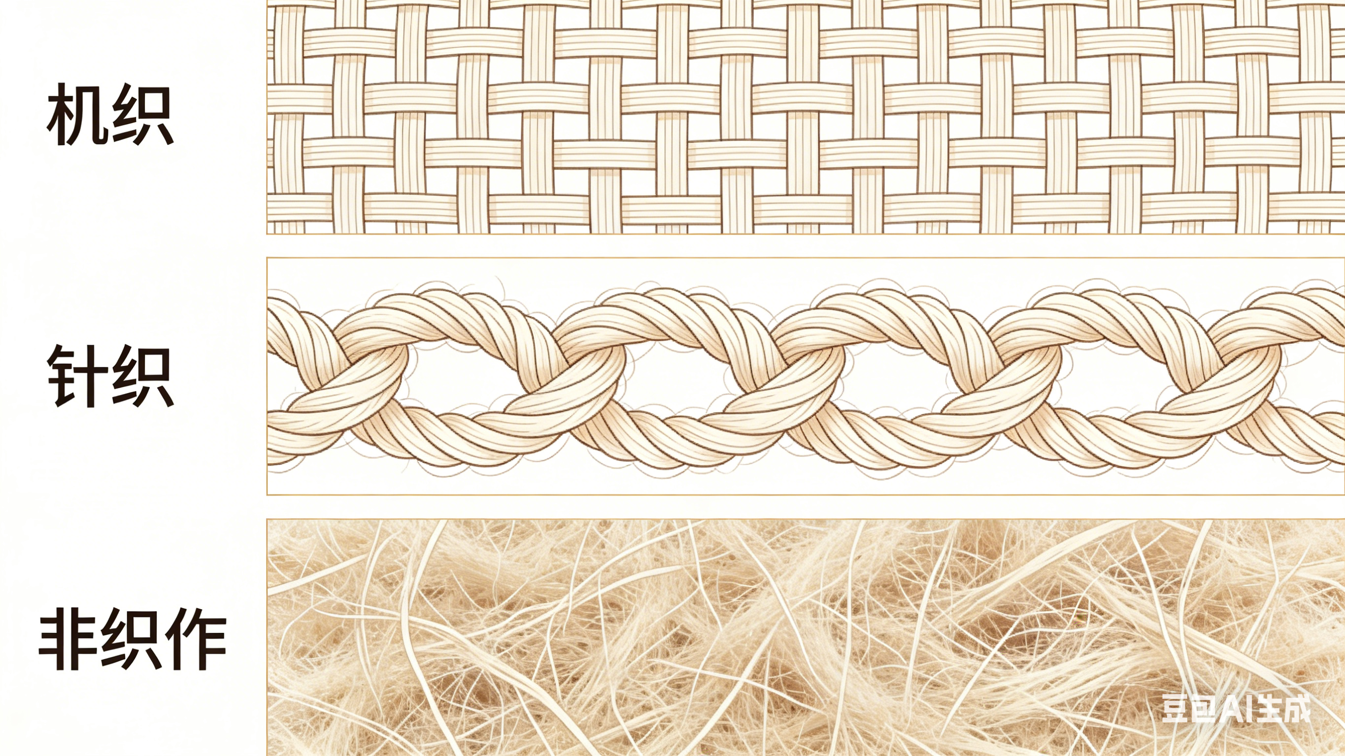 非织造无需经过“纱线纺纱-织布”的传统步骤,直接将纤维(天然或化学纤维)通过粘合、热压、针刺、水刺等方式固结在一起,形成类似“纤维毡”的片状材料,无明显经纬纱之分。